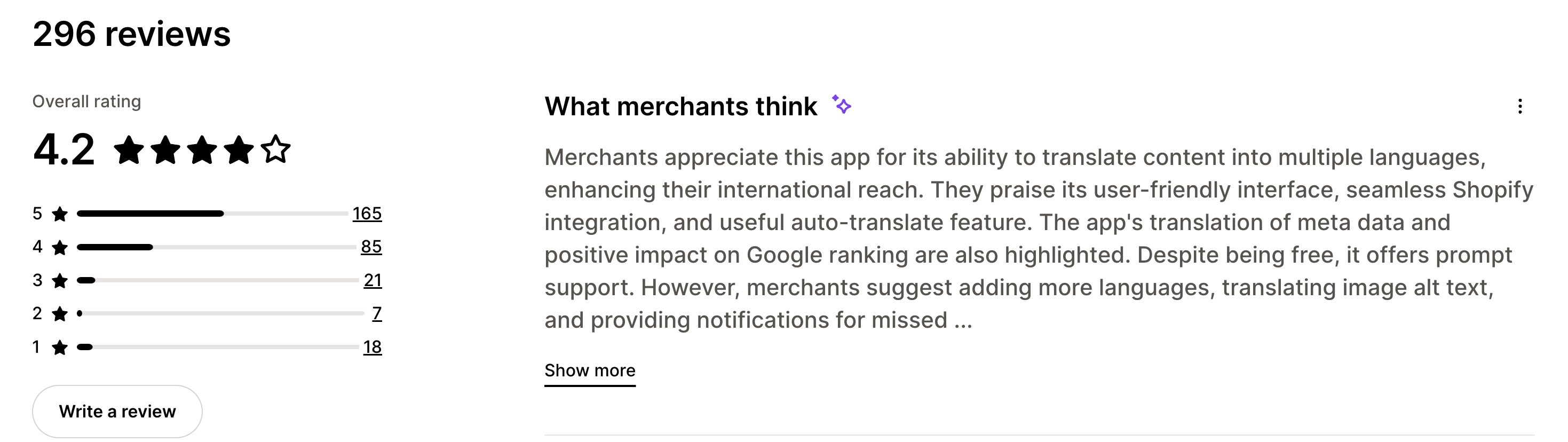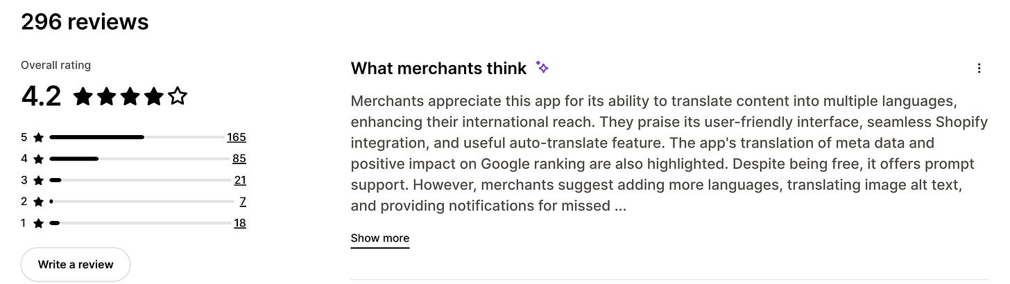 Shopify is also using Magic for summarization, not just generation. App store reviews are being distilled into concise summaries for users. And Shopify's own Help Center now has an assistant to answer questions based on existing knowledge base articles.
