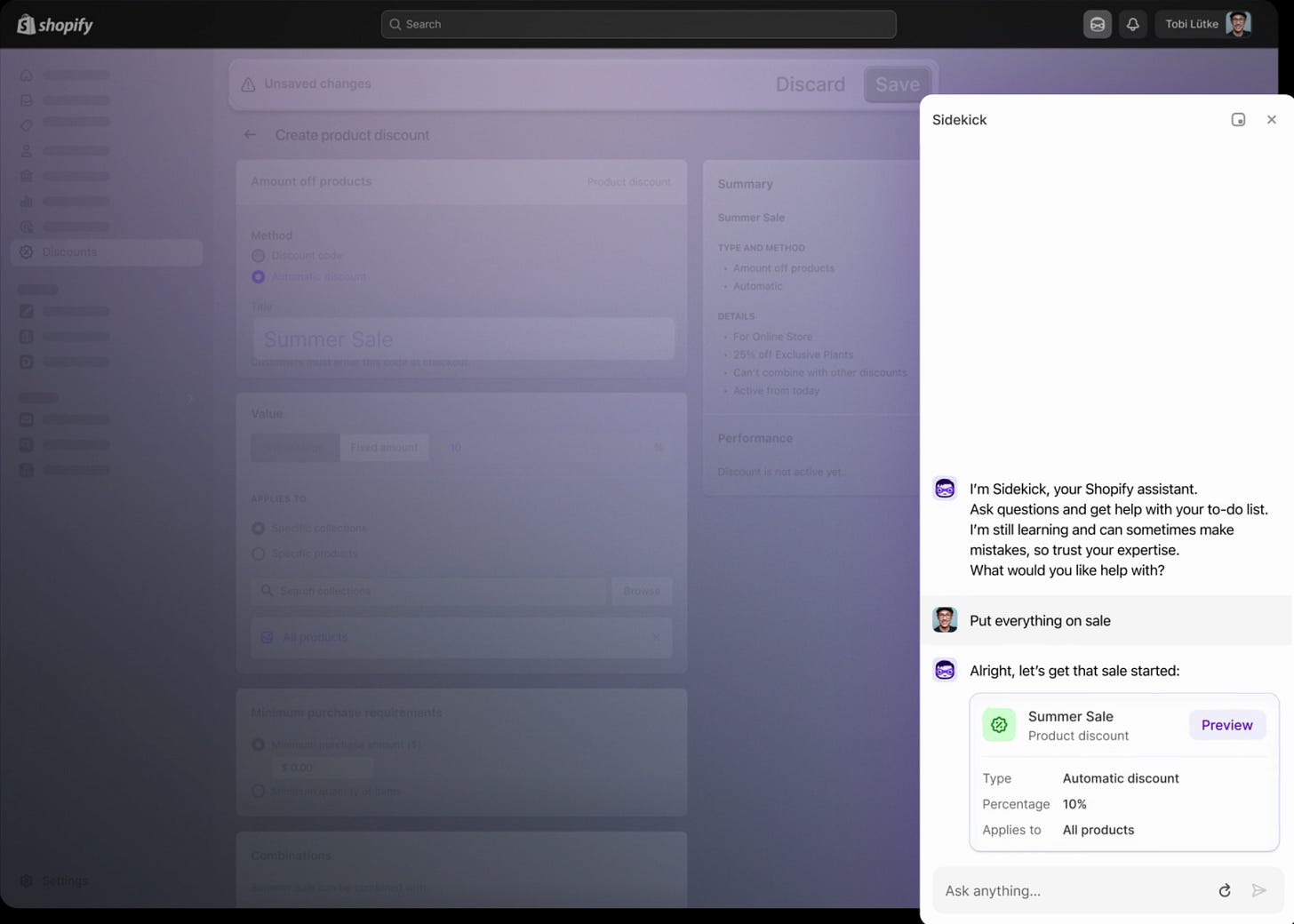 Which is why Sidekick could actually be a pretty big deal. It's designed to help surface insights from across the Shopify admin, which, as we've discussed, is very broad. And the early previews look like it's able to take actions within that admin as well, to do things like generate a discount code or write a blog post. Having hooks directly into the platform makes Sidekick different from all of the thin wrappers around ChatGPT.
