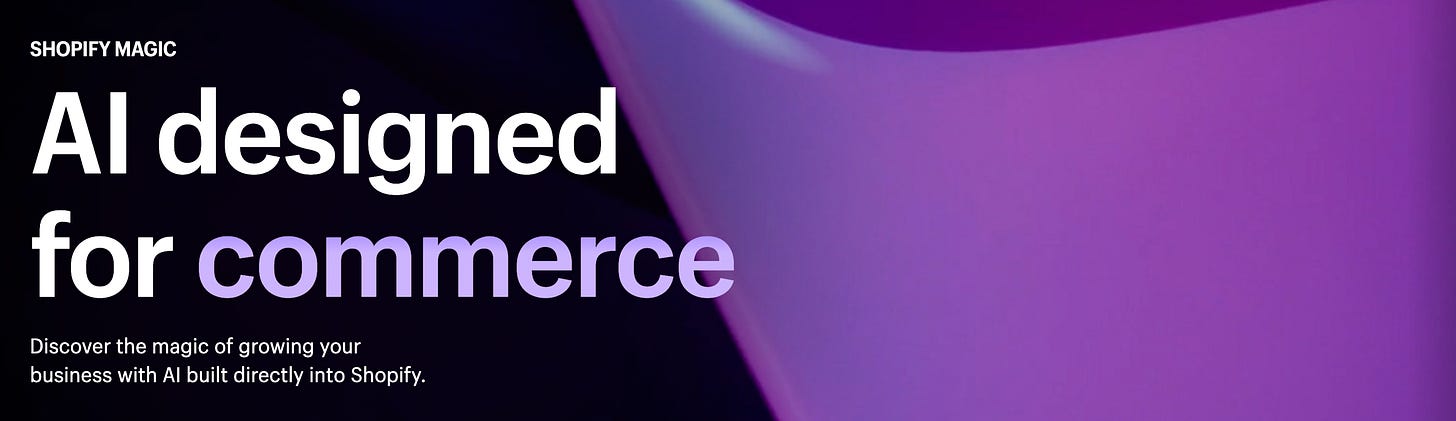 On the merchant side, most of the AI features have been lumped into what's being called "Shopify Magic." Magic (so far) mostly consists of text generation (presumably via a large language model like GPT-3). Shopify first made this available for product descriptions in April, and has since added the capability to other aspects of the platform, including email marketing and online store customizations3.