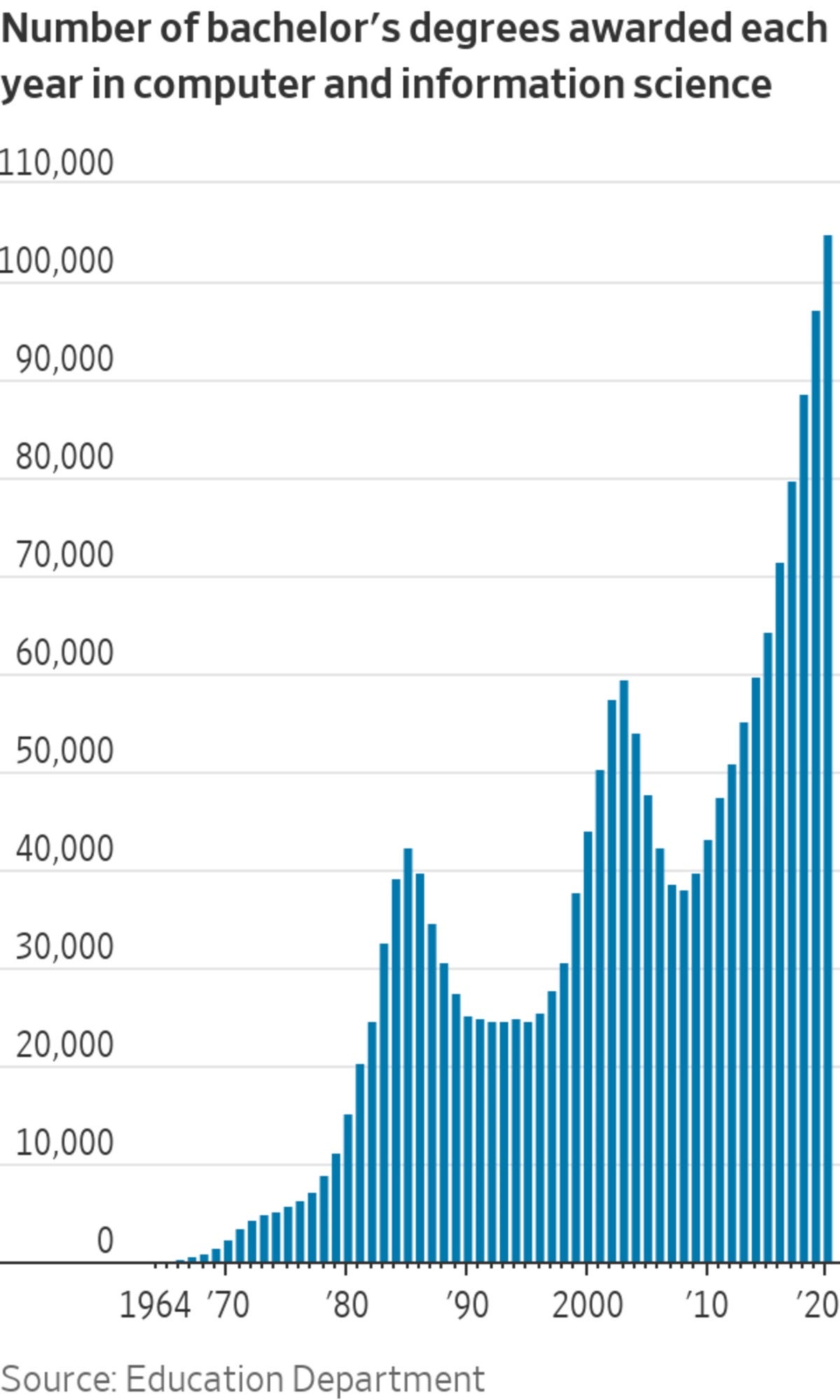 We can literally see the result in the data: universities are graduating twice as many computer science majors as they did a decade ago - from around 50,000 in 2013 to over 100,000 in 2022. Which is impressive, considering that a significant percentage of software engineers are concerned that AI may soon automate us all out of jobs, starting with recent graduates.