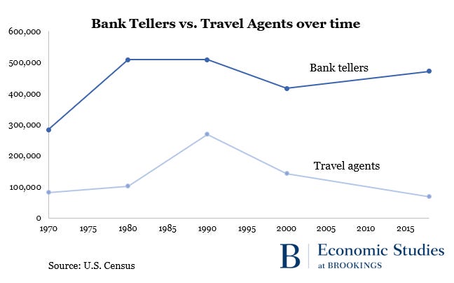 We've seen Jevons Paradox, and the related concept of induced demand, play out across different industries. One example is ATMs: first introduced in 1969, they took hold a few decades later and threatened the bank teller's job. Yet by 2010, there were almost twice as many bank tellers as there were in 1970. The increased usage of ATMs contributed to more bank branches, leading to more jobs. This is in stark contrast to, say, travel agents - a job that peaked in the 1990s and has been in decline ever since.
