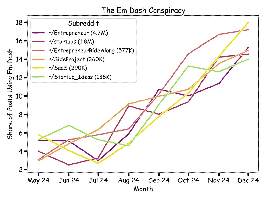 In fact, one Reddit user published what he called “The Em Dash Conspiracy”: real data on how frequently Reddit comments use em dashes (and perhaps, by proxy, AI). Using Reddit’s API, he downloaded the top 1000 posts from the past year for several technology and startup subreddits and tracked what percentage of them contained em dashes. The chart is striking: