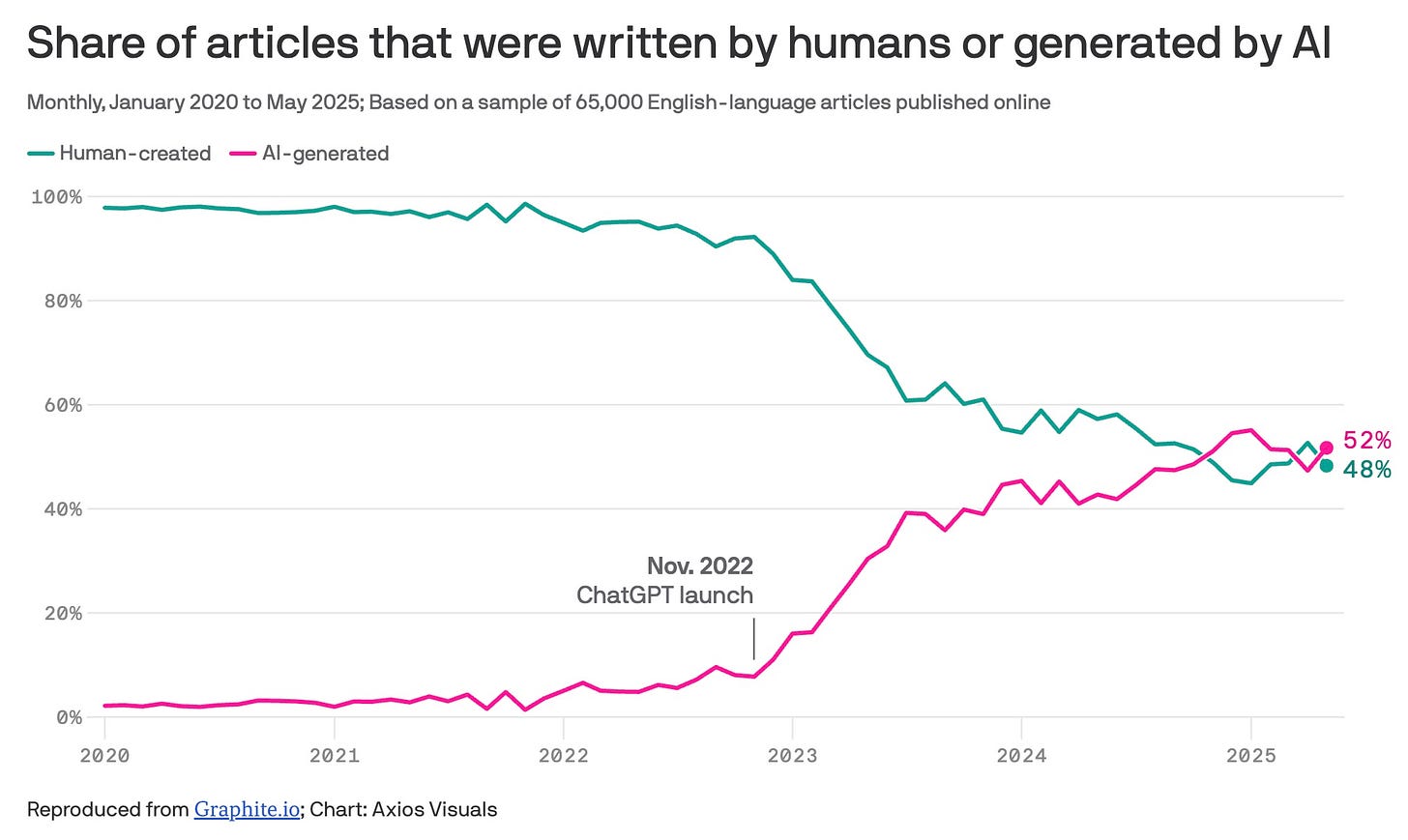 And my fears don’t appear to be completely unfounded. One report from SEO firm Graphite suggests that as of last November, more articles were being written by AI than humans (though new data suggests that the rate is now close to even). Meanwhile, an ongoing study from Originality rates around 17% of the top 20 Google results are AI-generated. And data from both Slack and AP-NORC indicate that at least 40% of workers (if not more) are using AI regularly, primarily for searching, ideating, and writing emails.