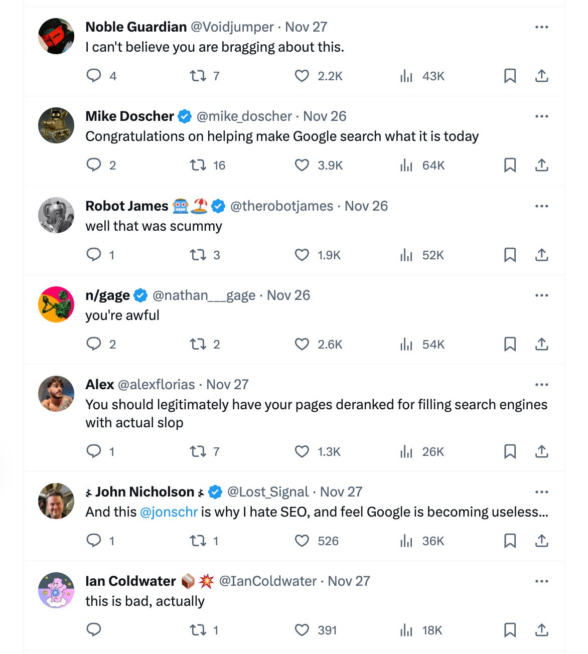 People, understandably, were upset. Many pointed out that Google has become worse at surfacing useful information - many times, the top links are SEO-optimized fluff. A classic example: recipes that explain the author's entire life story before telling you how to make kung pao chicken.