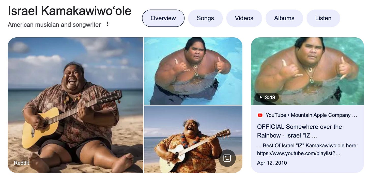 But it’s worth thinking about those second-order effects. Because with AI, we're poised to get even fewer factual results from the web than we do today. Another recent example shows that searching for singer Israel Kamakawiwoʻole results in AI images in two out of three thumbnails: