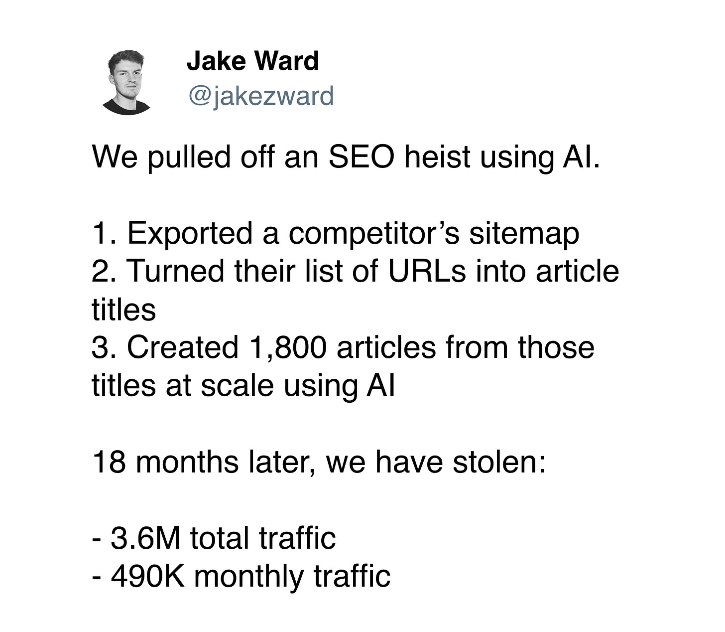This week, an SEO consultant inadvertently became Twitter's villain of the day when he bragged about “stealing” SEO from a competitor by flooding their keywords with AI content.