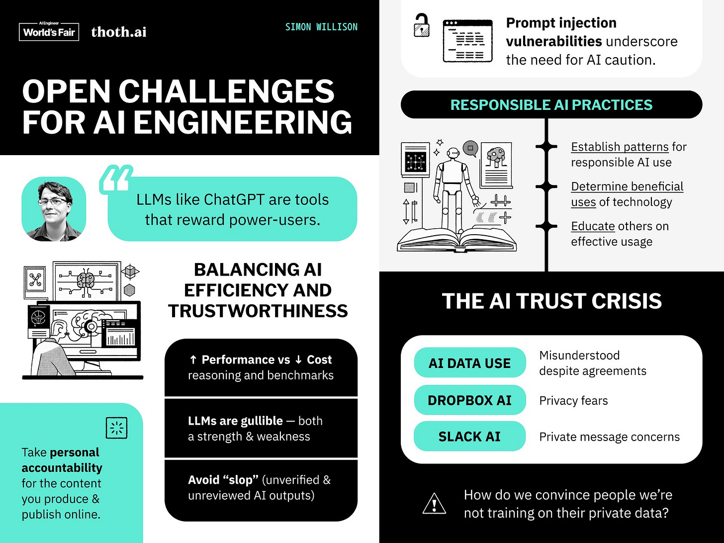 That's not necessarily a bad thing - every ecosystem matures eventually. But there was also a growing sense of responsibility; many of the challenges in AI Engineering aren’t strictly technical. Drawbacks like hallucinations or prompt injection aren’t going away any time soon, and it’s up to the builders to educate others on how to use LLMs effectively.