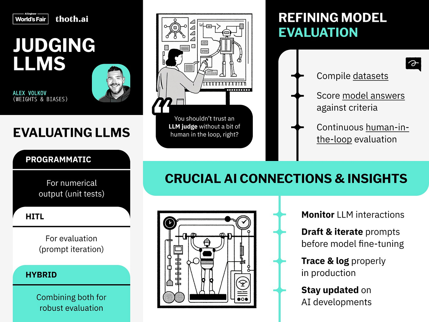 Beyond the basics, there was much discussion about emerging techniques. One that repeatedly came up was “LLM as a judge” - using GPT-4 to evaluate how well your prompts are working. There are some big tradeoffs here, not least of which is the risk of removing the human from the loop.